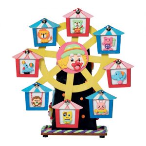 摩天輪各木製配件由鐳射切割而成,無須打磨木邊亦不會刺手,木質平滑,表面可直接使用各種顏料上色,亦可配合粘土、馬賽克等材料創作,組合完成後更可作錢箱使用。備有五款相框款式及天空之城或給愛麗絲兩款音樂供選擇。